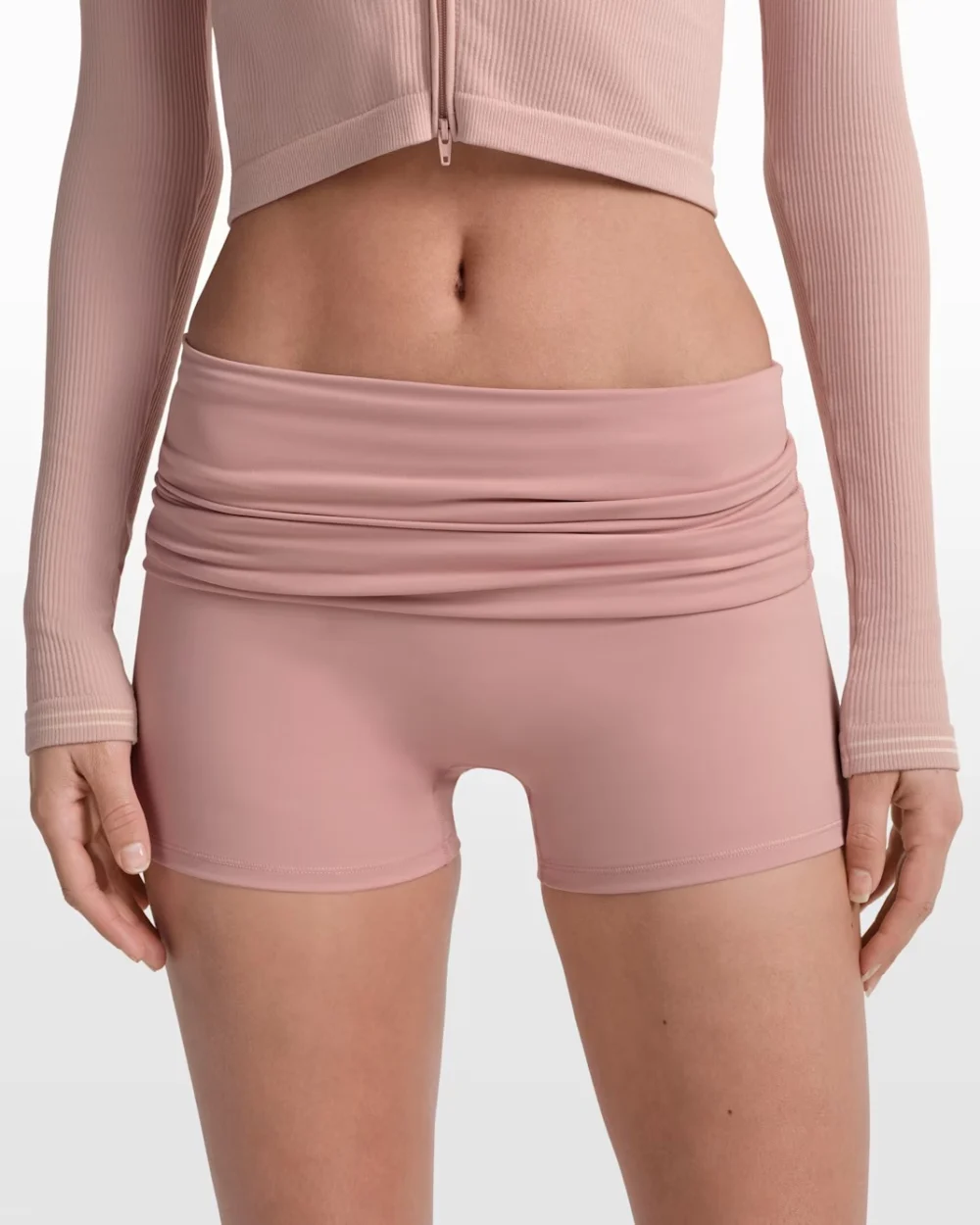 NikeSKIMS Matte Women’s 3” Fold-Over Waistband Shorts: Designed for comfort and a sleek profile, these shorts hug the body without chafing. The seamless construction ensures a smooth, minimalist look, perfect for active days or as a comfortable base layer.