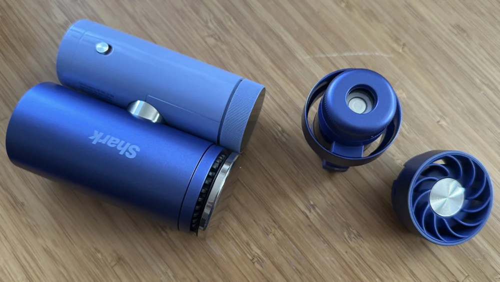 The physical architecture of the Shark ChillPill is designed for versatility. The handle of the device features a 180-degree hinge that allows it to contort into various shapes. When fully extended, it serves as a traditional handheld fan with an ergonomic grip; when twisted, it forms its own base, allowing it to sit securely on a desk, nightstand, or airplane tray table. This adaptability targets a broad demographic, from office workers in aging buildings to outdoor enthusiasts attending summer festivals.