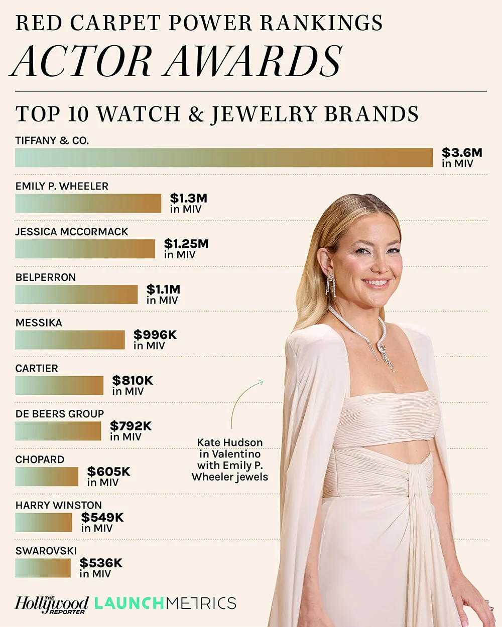 Notably, independent designers also achieved significant recognition. Los Angeles-based Emily P. Wheeler secured second place with $1.3 million in MIV, outfitting Kate Hudson with exquisite diamonds to complement her Valentino gown. London-based Jessica McCormack followed closely, providing a suite of jewels to the Hamnet star, generating $1.25 million in earned engagement. These breakthroughs highlight the increasing visibility and impact of smaller, artisan brands in the luxury market.